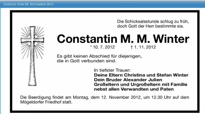 Mit einem Geschenk hinterlassen Sie Ihr persönliches Zeichen in Gedenken an Constantin Winter. Veredeln Sie jetzt für 2,99 Euro diese Gedenkseite durch ein Geschenk in Ihrem Namen.