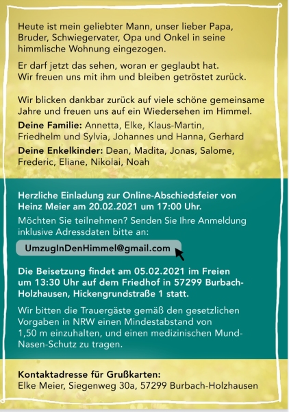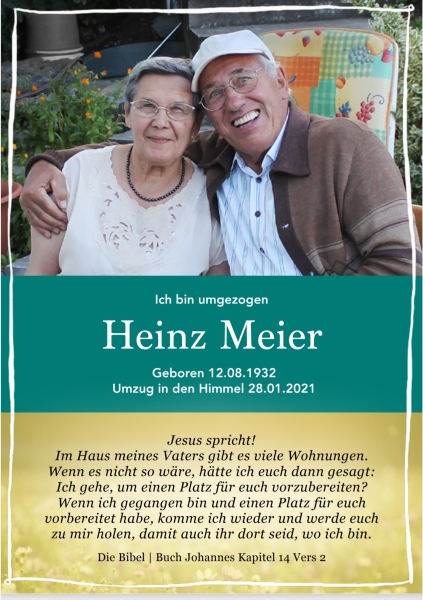 Mit einem Geschenk hinterlassen Sie Ihr persönliches Zeichen in Gedenken an Heinz Meier. Veredeln Sie jetzt diese Gedenkseite durch ein Geschenk in Ihrem Namen.