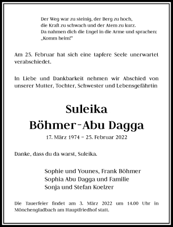 Mit einem Geschenk hinterlassen Sie Ihr persönliches Zeichen in Gedenken an Suleika Böhmer - Abu Dagga. Veredeln Sie jetzt diese Gedenkseite durch ein Geschenk in Ihrem Namen.